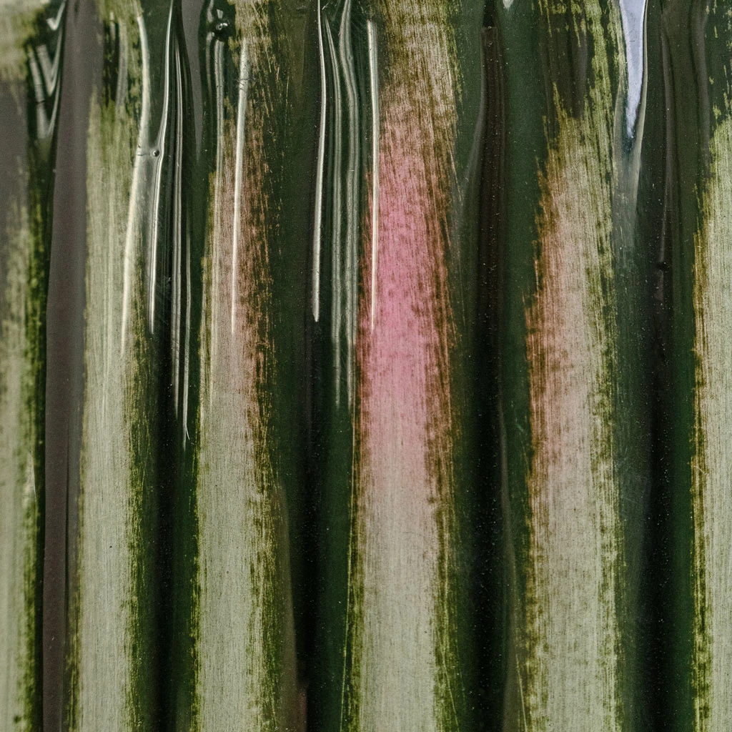 Dressed in a distressed sage green glaze revealing brushed white and red tones beneath, Nella radiates warmth and sophistication. A modern metal masterpiece with vertical ribbing and a stylishly stepped-in base, each one is made, coloured and distressed by hand to create subtle unique differences in colour and tone.