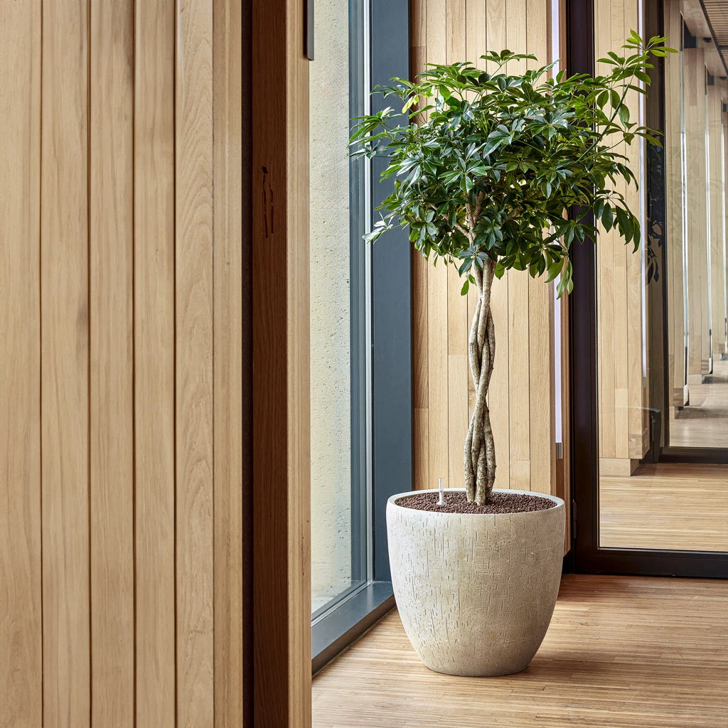 The Raindrop collection combines contemporary flowing lines with natural shades of grey and greige, as well as stone concrete textures, to deliver an oasis of calming greenery both inside (with a liner) and outside.